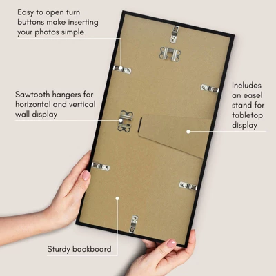 Showcase your memories with the Americanflat 8×16 picture frame, designed to elevate every moment. Crafted from high quality and durable material (PVC) with a sleek, slim molding, this is more than a picture frame; it’s a game changer for your decor. The shatter-resistant glass front offers clarity while protecting your poster or artwork from dust and scratches. Versatility meets style with these black picture frames. Hang it vertically or horizontally using the included hanging hardware, or use the easel stand for tabletop display. Whether you’re displaying a poster, artwork, or photo, our gallery-style frame is the ideal way to showcase your cherished memories anywhere in your home or office. No matter how you style it, the black finish adds a timeless touch, instantly elevating your space. Refreshing your display has never been easier. The easy-to-use turn points make swapping photos a breeze, so you can update your walls as often as you like. Plus, the sturdy backboard keeps everything securely in place, ensuring your memories always look their best. Why settle for boring walls when you can have a gallery at home? This photo frame is built to last, combining style and functionality to create keepsakes you’ll treasure forever. Order yours today and join thousands of satisfied customers who’ve transformed their spaces with Americanflat.