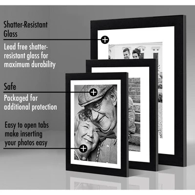 - Durable, gallery-style frames; the frame fronts have clear tempered shatter-resistant glass and sturdy backboards to keep the photos in place; load your photos, cards, and memories easily, quickly and securely